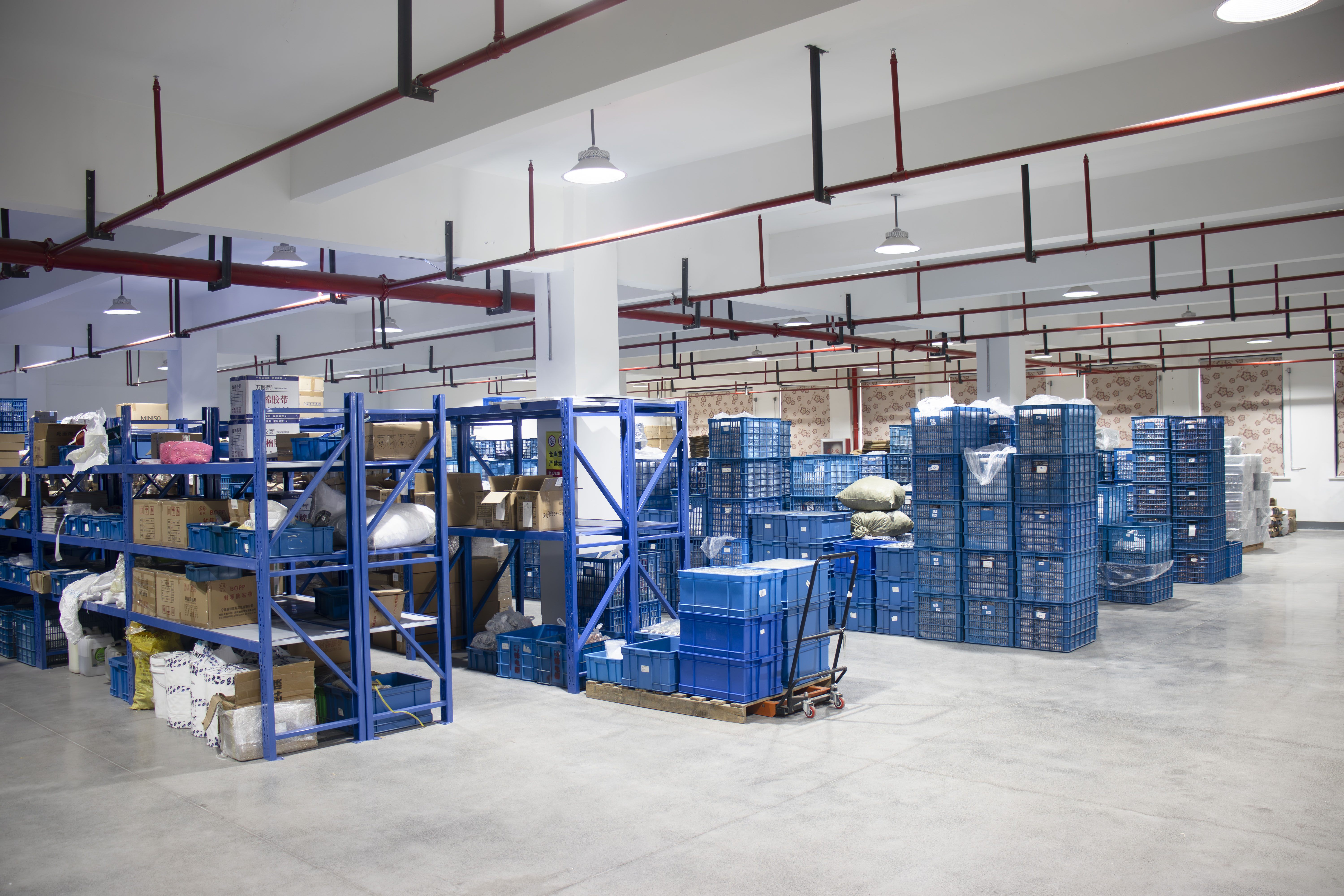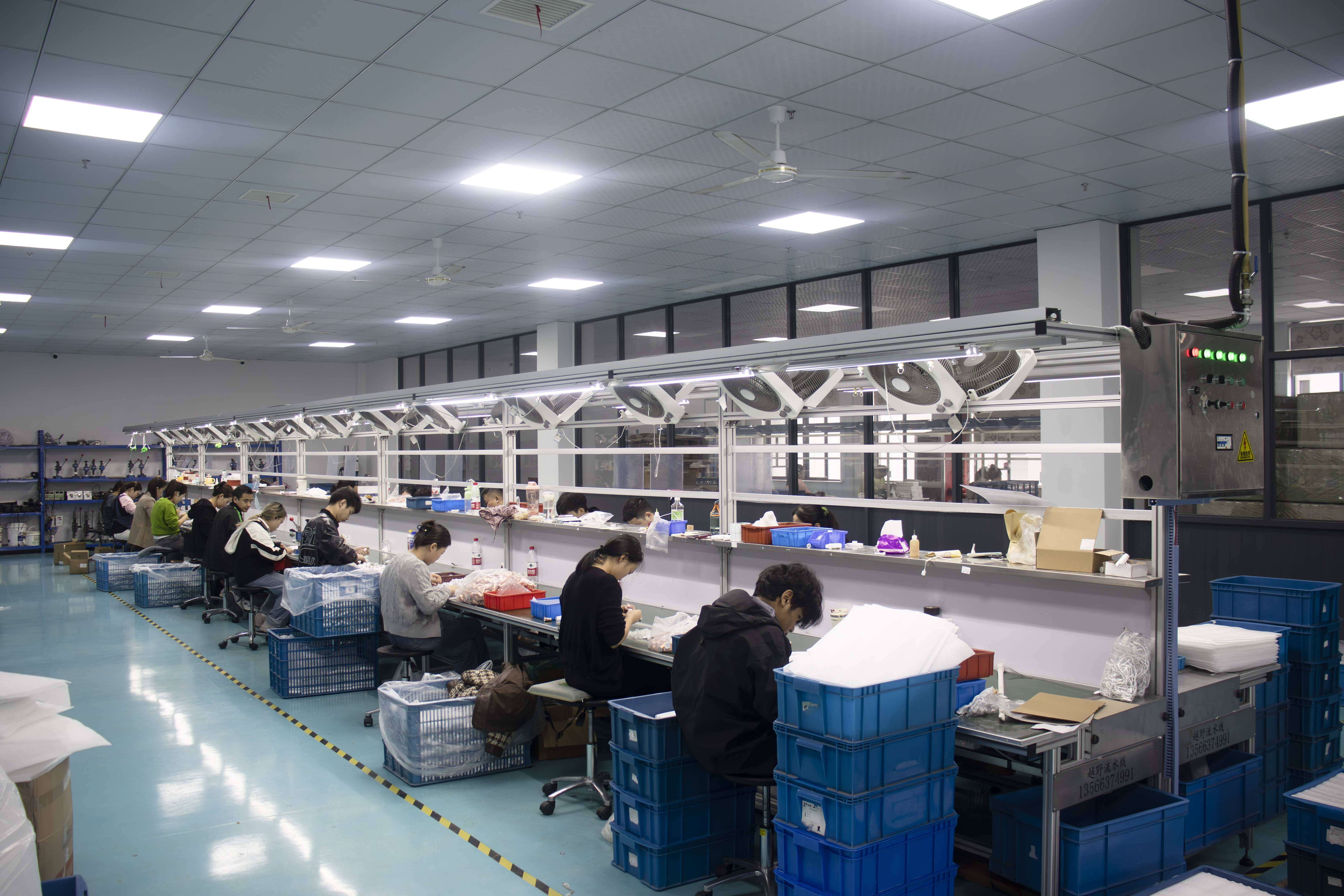 O workshop apresenta piso de epóxi azul claro com linhas de demarcação amarela, definindo claramente as áreas de trabalho e os canais de materiais. Os componentes são categorizados em caixas de armazenamento azul, enquanto as estações de trabalho de montagem são equipadas com sistemas de iluminação sem sombra e ventilação industrial. As prateleiras de várias camadas traseiras armazenam materiais de produção, sincronizados com terminais de controle para monitorar o uso de materiais em tempo real e minimizar o tempo de inatividade.